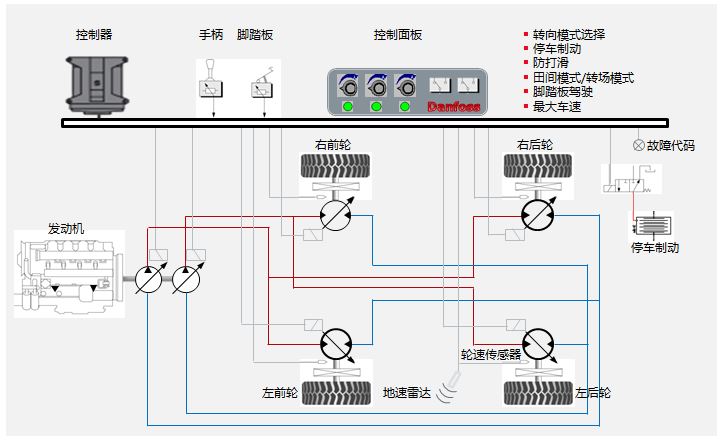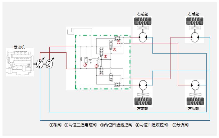 马达处于并联状态,前后马达压力一致,液压系统会自行分配前后马达流量以保证前后轮胎同步。