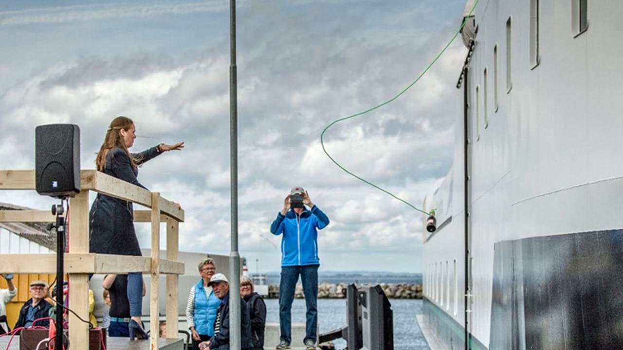 在举行仪式和洗礼之后,数千人在港口欢呼,随后人们站成一队绕着这艘崭新的渡轮目睹其风采,了解其所搭载的能使船只航行速度更快且无污染的电动技术。