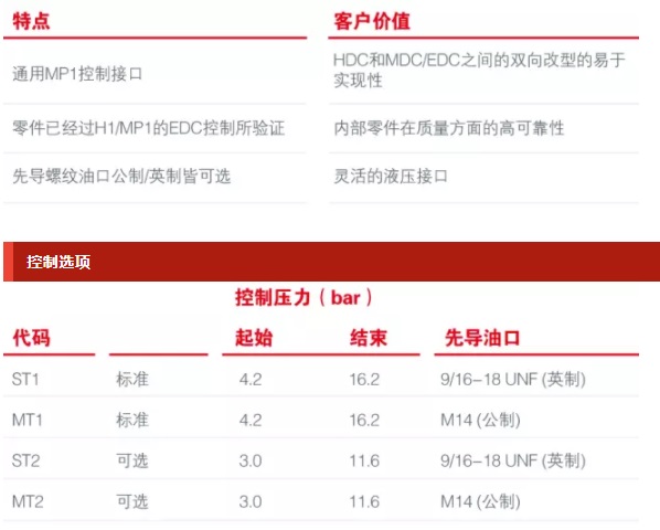 丹佛斯很高兴地向您介绍 MP1 闭式轴向柱塞泵现已发布新的液压排量控制(HDC)选项。HDC 选项于2017年5月1日成为 28/32及38/45 排量的标准选项,成为继 FNR、EDC、MDC 控制后的又一选择,将拓展 MP1 在中载市场中的应用。