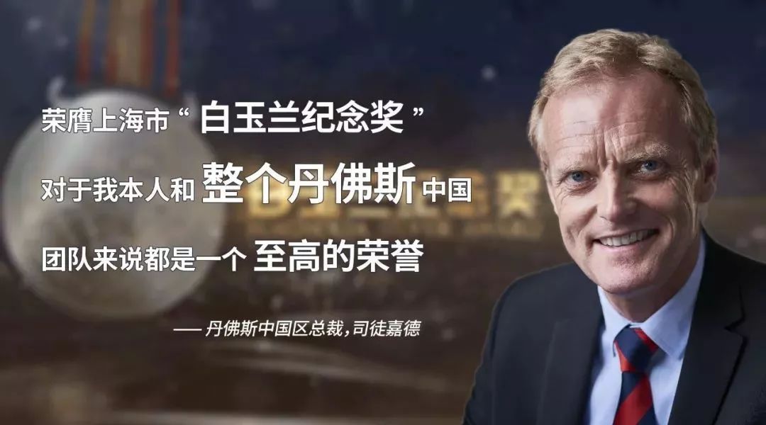 9月12日,上海市政府为丹佛斯中国区总裁司徒嘉德颁发2019年度“白玉兰纪念奖”,以表彰他及丹佛斯公司为中国尤其是上海社会和经济发展所做出的特殊贡献。