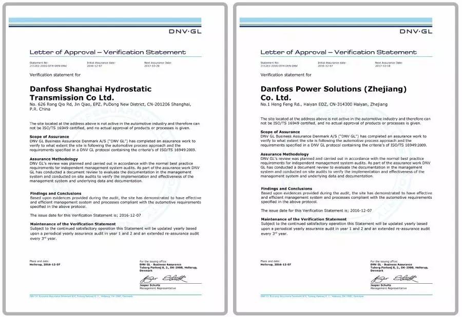 在2016年年底, 丹佛斯中国的上海工厂和海盐工厂均通过了第三方DNV的符合性审核。