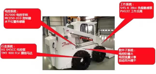 丹佛斯动力系统中国在海盐的ADC同样也设计改制了一台最新一代电控滑移装载机。全套液压系统采用了Danfoss高性能的液压元件—H1电比例重载闭式泵、TMT摆线马达、S45负载敏感泵及PVG比例多路阀,结合了Danfoss的PLUS+1 Guide 图形化开发平台,及强大的MC控制器及JS操作手柄。