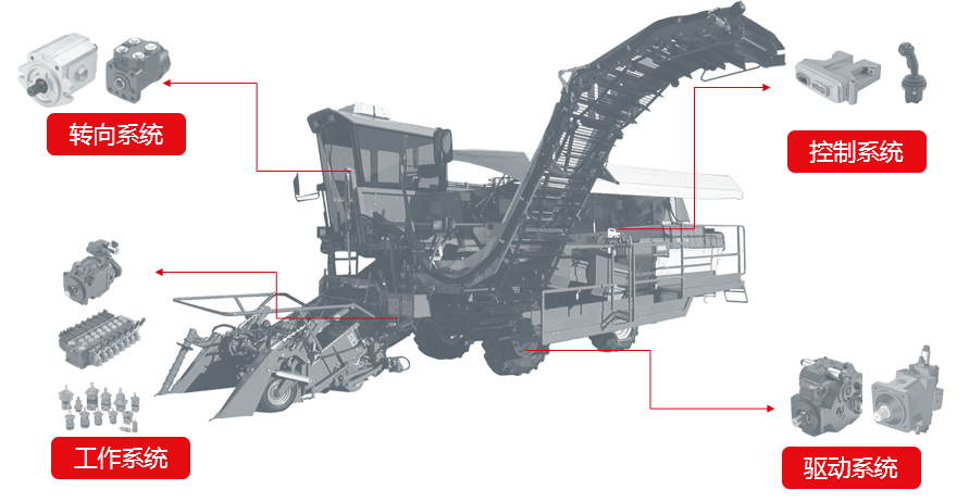 甘蔗收割机的风机功率很大,且要求要有稳定的速度控制。由S90系列重载泵、马达组成的闭式传动系统,功率密度高,性能稳定,寿命长,可无极调速,为风机装置提供充沛的动力。
