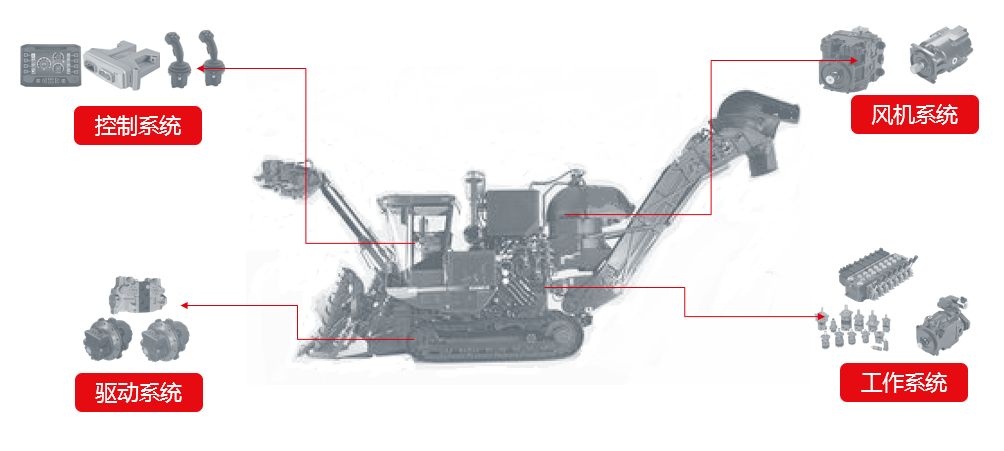 采用负载敏感开式泵、PVG多路阀、HIC块集成总成以及马达组成的负载敏感系统;负载敏感变量泵,通过控制阀组为各个油缸和马达提供动力油。PVG阀提供高精度的流量控制,HIC模块可以提供特殊控制功能,各种摆线马达为不同的回转动作提供动力。