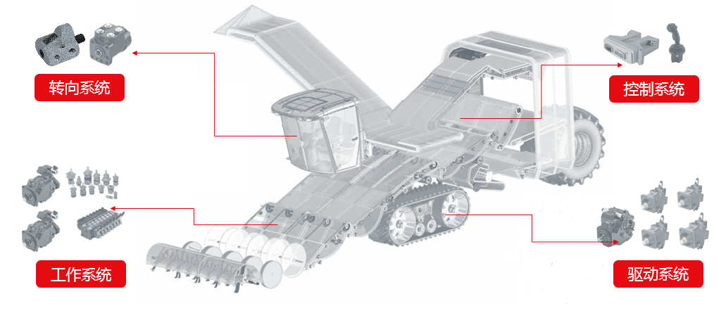 多个S45泵、PVG阀组及不同种摆线马达组成的工作系统,为收割机的各个部件提供动力;负载敏感系统带来的节能特性及内带闭环反馈传感器的PVG阀,对各个马达及油缸精准控制,使得收割机的各个动作精准而又有力的匹配。