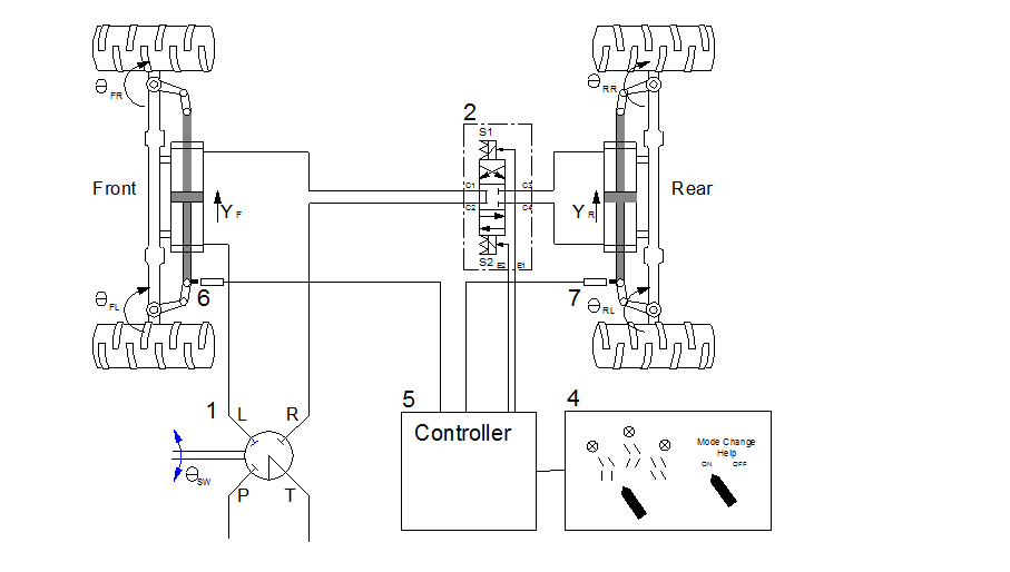 轮式湿喷机施工空间比较狭小,为了能满足这种特殊工况,前后车桥都带有转向连杆机构。与此同时,它还有多重转向模式可以选择,前轮转向,后轮转向,同步转向,蟹型转向。通中间的换向阀不同位置实现不同转向模式。