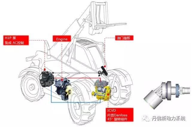 •集成丹佛斯AC控制的H1P闭式泵结合内置丹佛斯45°旋转组件的ICVD无级变速箱使得徐工新一代的伸缩臂叉装车实现了真正意义上的无级变速。