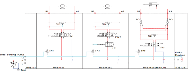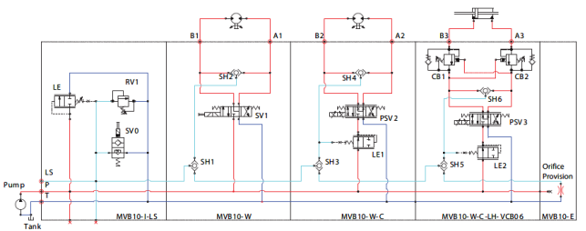 ▌以下是变量泵使用的3联工作阀组,其中第一联是开关阀控制;第二联是比例阀控制+补偿器;第三联是比例阀+负载保持液压阀;通过输入联带有LS、P、T油路通道进行工作。